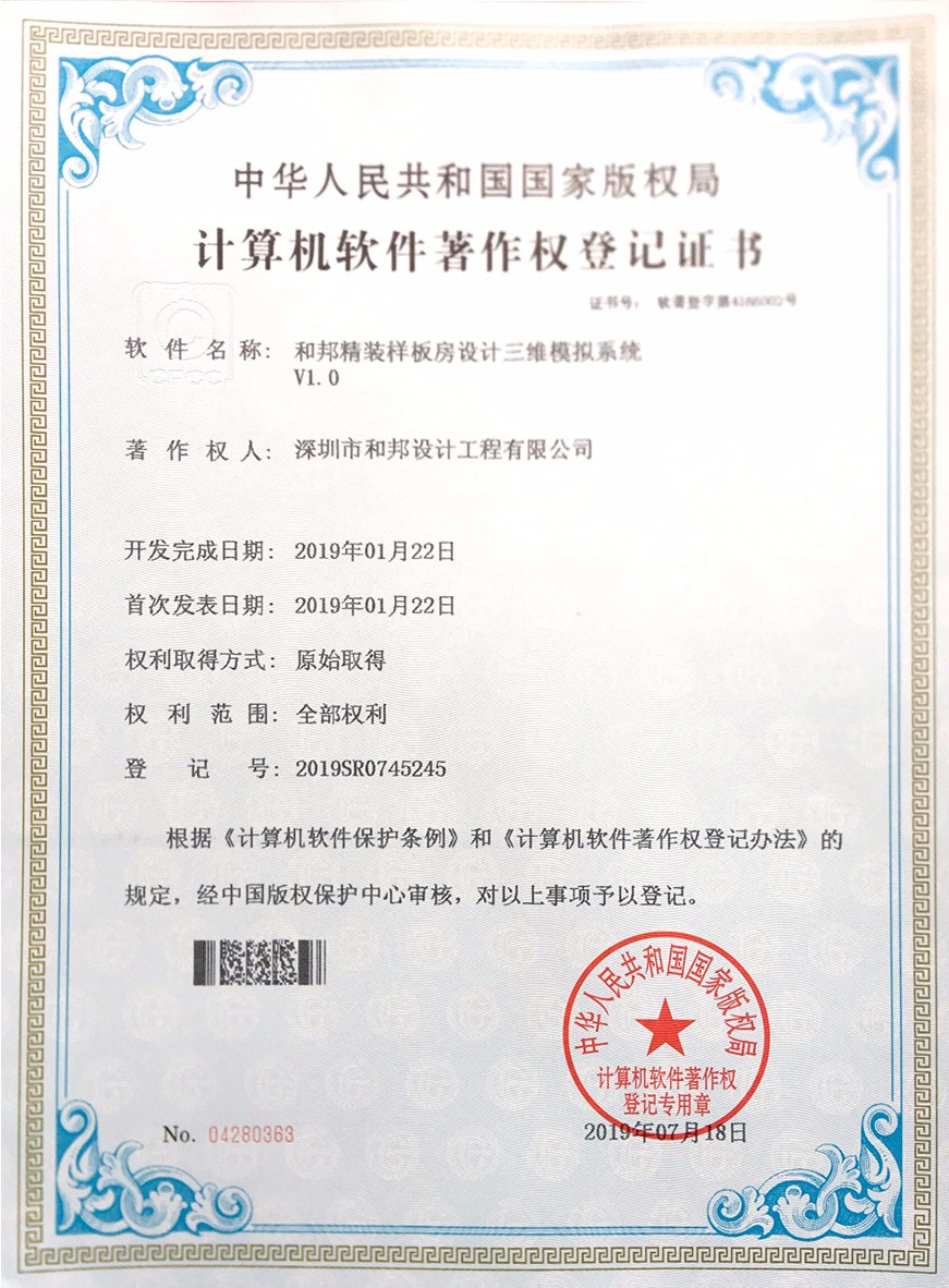 根據《中華人民共和國計算機軟件保護條例》和《計算機軟件著作權登記辦法》的規定,經中華人民共和國國家版權局審定,我公司自主研發的7款軟件被正式授予《中華人民共和國國家版權局計算機軟件著作權登記證書》,7款軟件分別為:“和邦別墅裝修效果智能優化系統V1.0”、“和邦室內辦公環境空間模擬規劃系統軟件V1.0”、“和邦別墅裝飾色彩搭配設計模擬軟件V1.0”、“和邦室內裝修效果3D模擬系統軟件V1.0”、“和邦精裝樣板房設計三維模擬系統V1.0”、“和邦別墅室內采光效果智能分析系統V1.0”、“和邦園林式別墅格局規劃設計系統軟件V1.0”。
